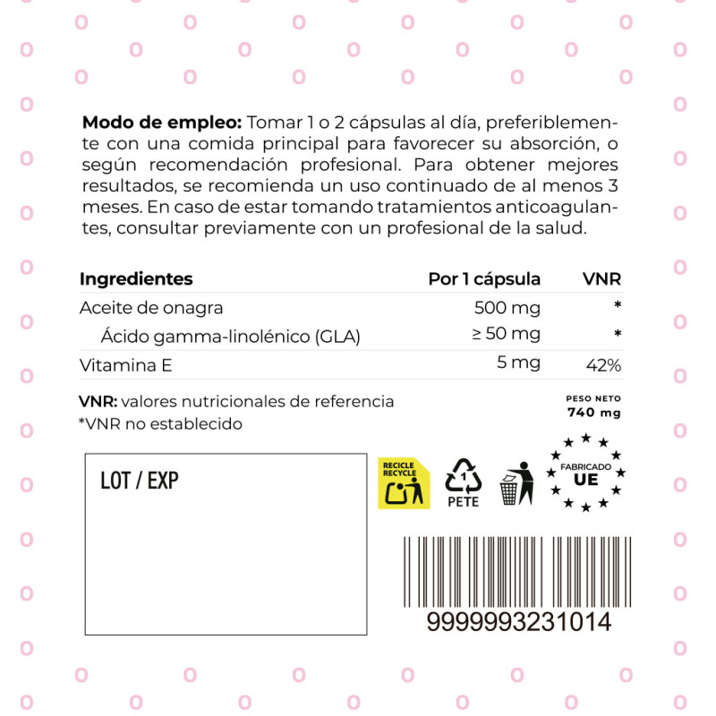 Cada cápsula vegetal contiene 500 mg de aceite de onagra puro (Oenothera biennis L.) obtenido mediante prensado en frío, con un contenido garantizado de 10% de GLA (ácido gamma-linolénico), un ácido graso esencial con beneficios antiinflamatorios y hormonales. Además, está enriquecido con 5 mg de vitamina E natural, un antioxidante que protege frente al daño oxidativo y mejora la conservación del producto.