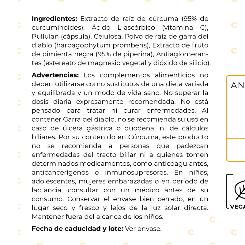 Dosis diaria: Tomar 2 cápsulas al día, preferiblemente con alimentos que contengan grasas saludables como aceite de oliva, aguacate o frutos secos para mejorar la absorción de la cúrcuma.