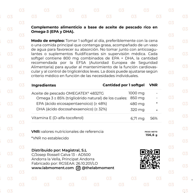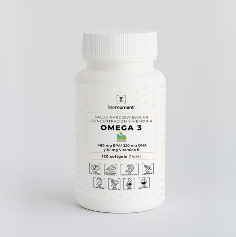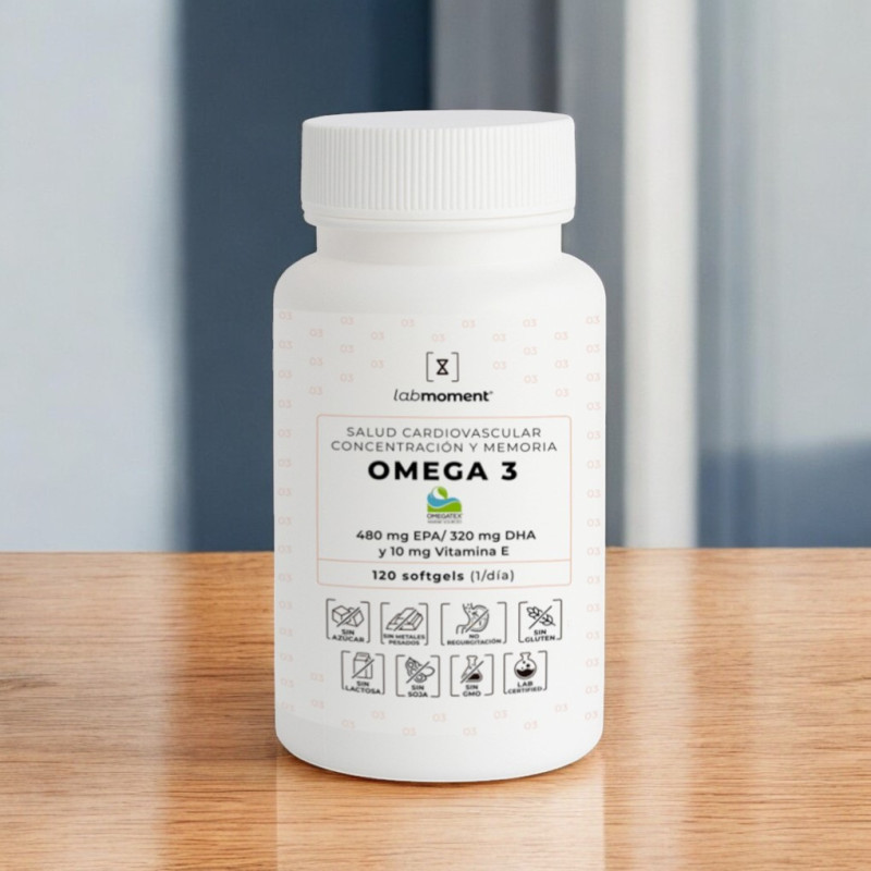 El Omega 3 de LabMoment, formulado con el concentrado marino OMEGATEX® 4832, ofrece una combinación única de alta concentración, pureza farmacéutica y excelente absorción intestinal. Cada cápsula vegetal entérica contiene 800 mg de ácidos grasos Omega-3, incluyendo 480 mg de EPA y 320 mg de DHA en su forma natural de triglicéridos, con eficacia clínica comprobada.